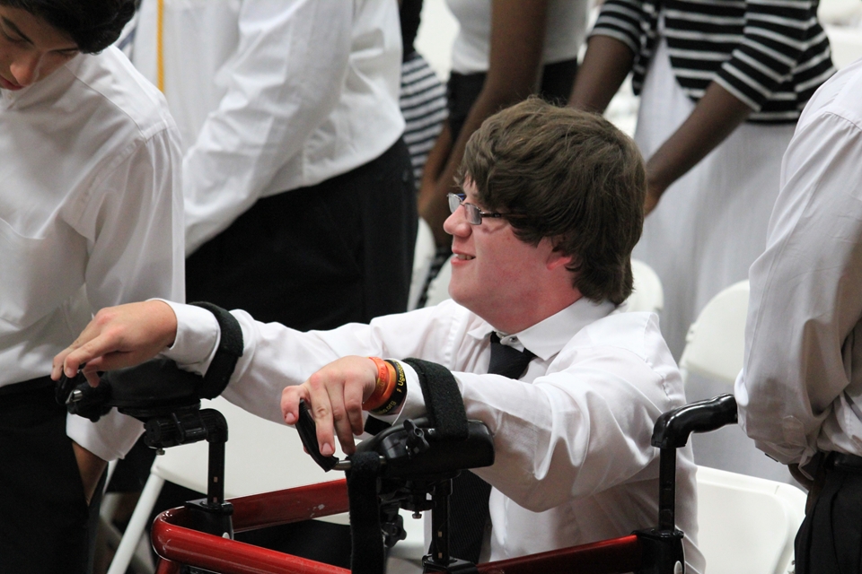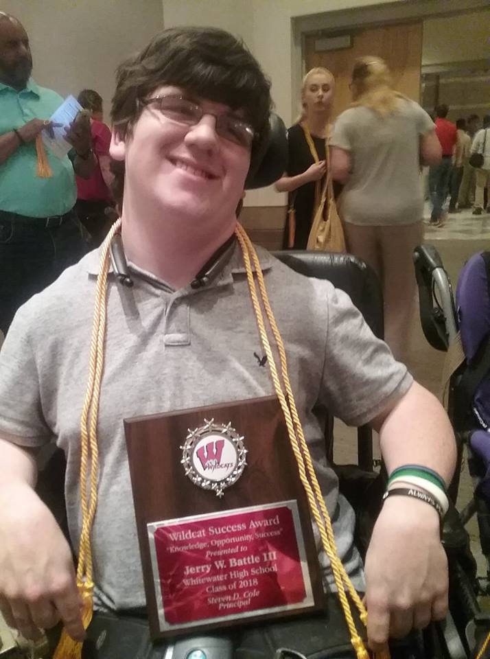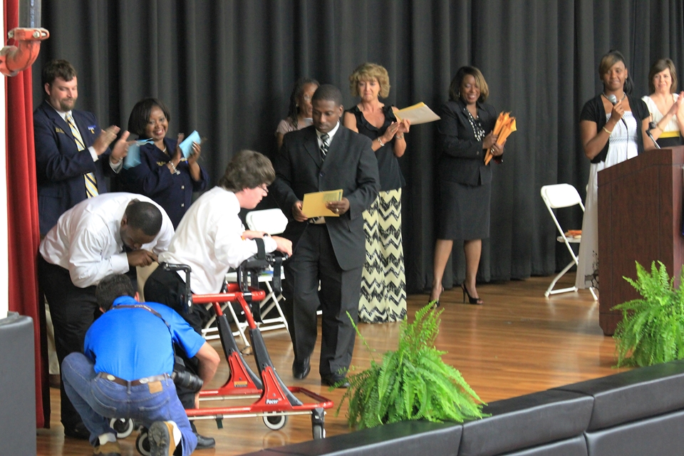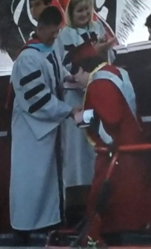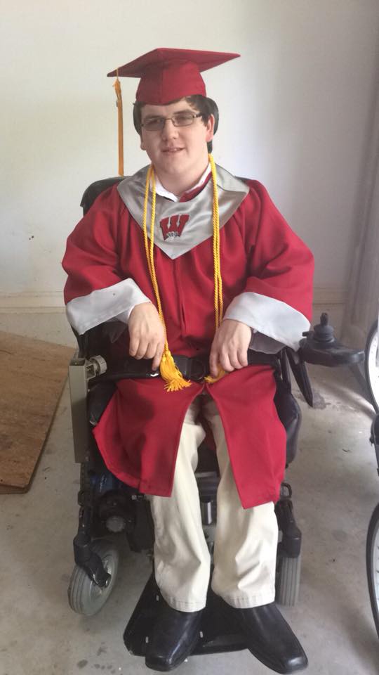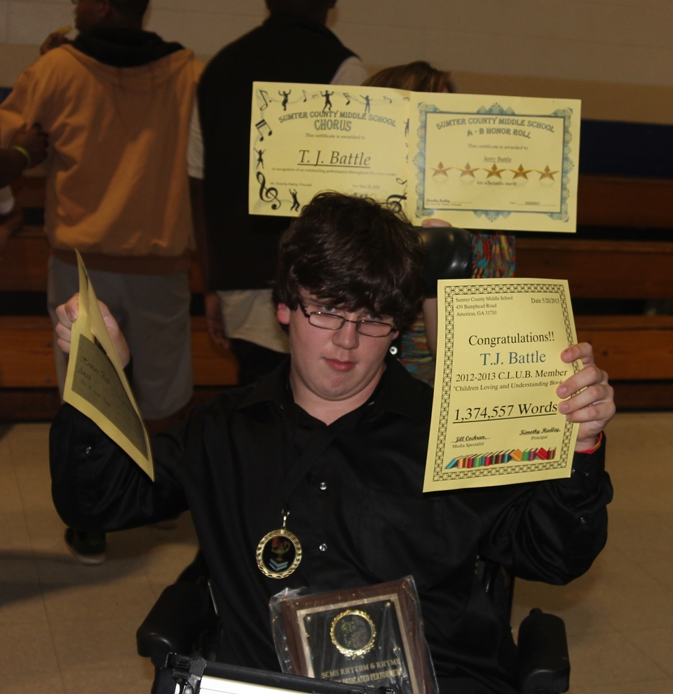 In May of 2013 TJ, with a little help, left the comfort of his chair and walked across the stage tor receive his graduation certificate from the 8th grade to high school. In the awards ceremony earlier he almost did not have enough hands for the awards.